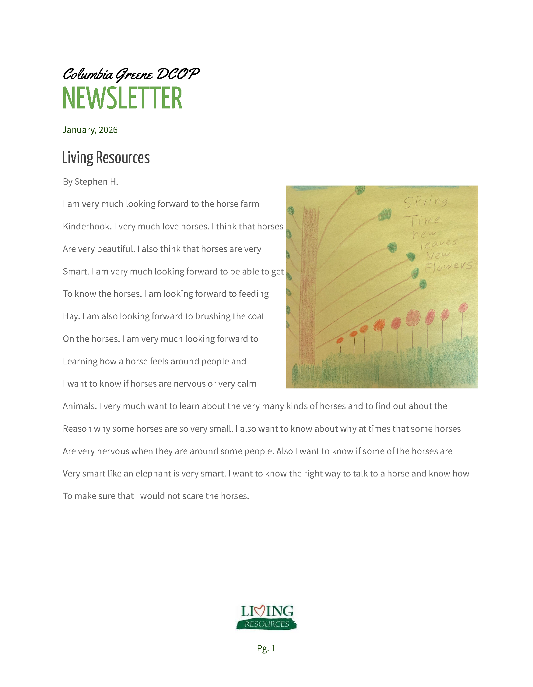 The start of 2026 has brought a wave of inspiration and creativity to our Columbia Greene Day Community Opportunities Program (DCOP). They have their very own newsletter where supported individuals can share their thoughts about life and their program. The latest newsletter is a beautiful tapestry of personal stories, artwork, and reflections from the individuals we support, showcasing the vibrant community spirit that defines Living Resources.