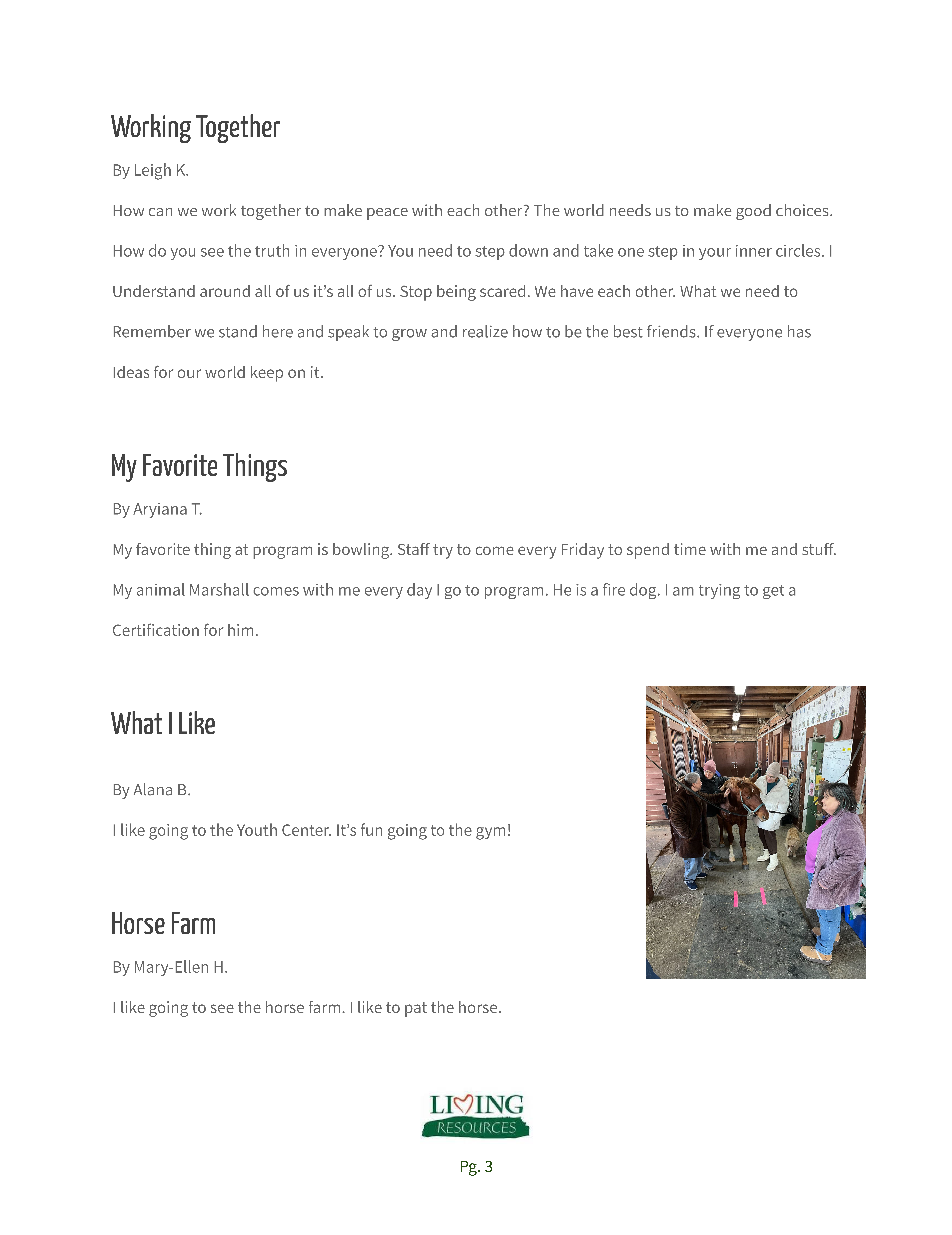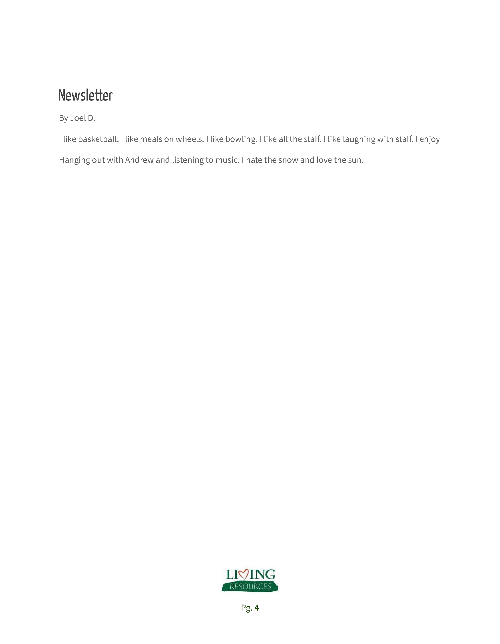 The newsletter also captures the profound sense of belonging felt by our members. Jade gave a special shout-out to the staff who make these activities possible. Kimberly reminded us all of the simple joy of connection, stating her favorite thing is simply “to see everyone” and spend time with her family. Leigh contributed a moving piece titled “Working Together,” urging us all to make good choices and find the truth in one another to “be the best friends” we can be. Aryiana shared a bit about her daily companion, Marshall, a “fire dog” she is currently working to get certified. Joel summed up the winter blues perfectly, noting that while he loves basketball, bowling, and laughing with staff, he definitely “hates the snow and loves the sun”.